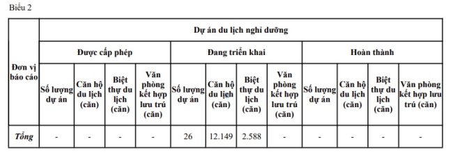 Theo báo cáo, hiện có 3 dự án nhà ở thu nhập thấp khu đô thị đang triển khai với 1.490 căn; 26 dự án du lịch nghỉ dưỡng với 12.149 căn hộ du lịch và 2.588 biệt thự du lịch đang triển khai.