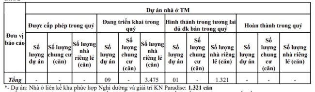 Bên cạnh đó, Khánh Hòa đang có 10 dự án nhà ở thương mại gồm 9 dự án đang triển khai trong quý với 3.475 căn nhà riêng lẻ và 1 dự án hình thành trong tương lai với 1.321 căn nhà riêng lẻ.