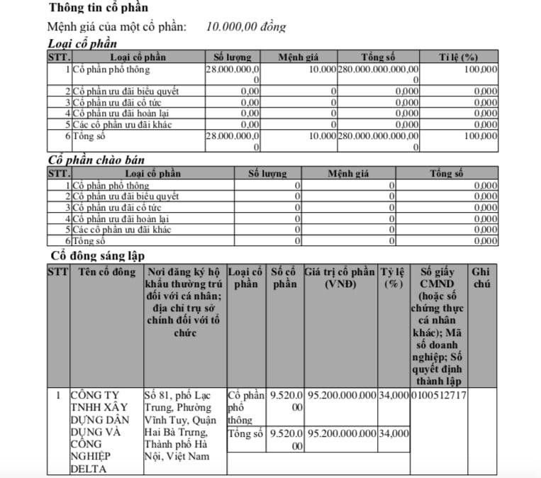 Ban đầu, công ty có vốn điều lệ 160 tỷ đồng. Cổ đông góp vốn gồm: Công ty TNHH Xây dựng dân dụng và công nghiệp DELTA góp 80 tỷ đồng (tỷ lệ 50%); Trần Thành Vinh góp 11,2 tỷ đồng (tỷ lệ 7%); Nguyễn Xuân Thu góp 8 tỷ đồng (tỷ lệ 5%); Trần Nhật Thành góp 51,2 tỷ đồng (tỷ lệ 32%) và Nguyễn Minh Hiền góp 9,6 tỷ đồng (tỷ lệ 6%).