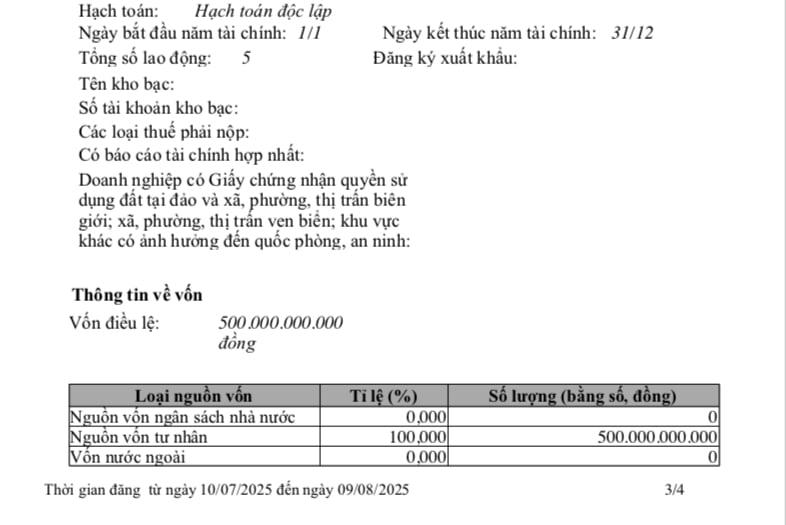 Đến thời điểm ngày 11/4/2025, công ty nâng vốn điều lệ lên 385 tỷ đồng. Cổ đông góp vốn không được đề cập. Tổng số lao động theo đăng ký thuế là 5 người.