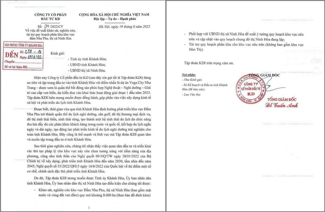 Văn bản nêu rõ, tại Khánh Hòa hiện Tập đoàn KD (KDI Holdings) đang sở hữu dự án Vega City Nha Trang, dự án dự kiến được đưa vào khai thác hoạt động giai đoạn 1 đầu năm 2023. Đồng thời, UBND tỉnh Khánh Hòa định hướng phát triển khu vực Đầm Nha Phu trở thành quần thể du lịch nghỉ dưỡng, sân golf, đô thị thương mại dịch vụ, đô thị sinh thái biển, sinh thái rừng, tạo thành một hệ sinh thái du lịch đa chức năng, thu hút đầy đủ các phân khúc khách hàng trong nước va quốc tế,…