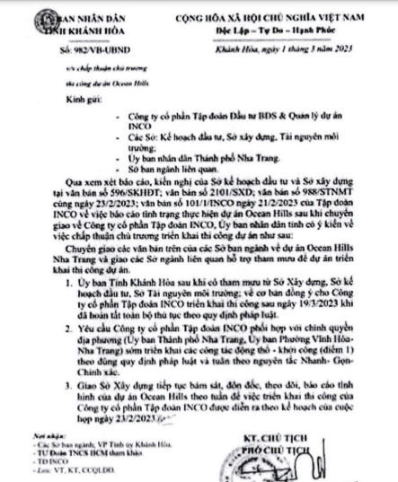 UBND tỉnh Khánh Hòa vừa ra thông báo kiểm tra, xử lý văn bản giả mạo Công văn 982/VB-UBND ngày 1/3/2023 của UBND tỉnh về việc chấp thuận chủ trương cho thi công dự án Ocean Hills.