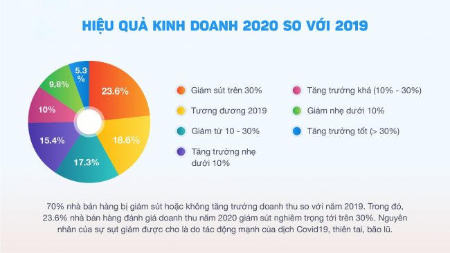 Mô hình bán hàng đa kênh thể hiện ưu thế trong mùa dịch, có tới 24,1% nhà bán hàng đa kênh trên sàn TMĐT, Facebook và Website ghi nhận có tăng trưởng doanh thu trong và sau dịch bệnh. Gần 24% nhà bán lẻ chuyển đổi hoàn toàn từ bán hàng truyền thống sang bán hàng online, nhờ vậy 56% trong số họ đã có sự hồi phục kinh doanh đạt hoặc vượt mức doanh thu của thời điểm trước khi diễn ra Covid-19.