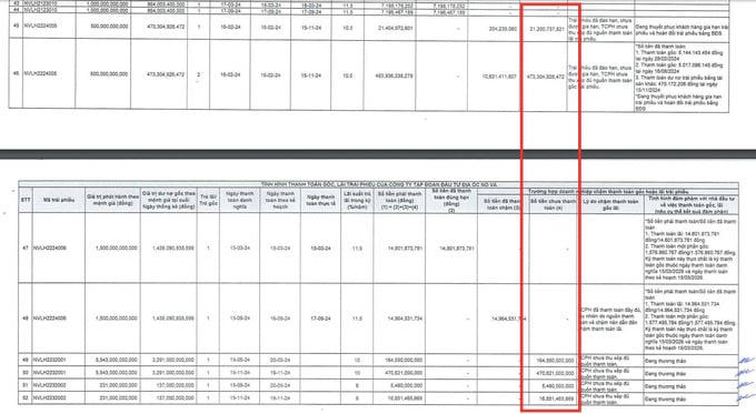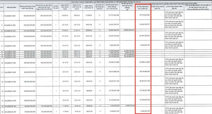 Theo văn bản công bố thông tin định kỳ về tình hình thanh toán gốc, lãi trái phiếu gửi Uỷ ban chứng khoán nhà nước, Sở Giao dịch chứng khoán Hà Nội và người sở hữu trái phiếu ngày 17/3, Tập đoàn Đầu tư Địa ốc No Va có 52 mã trái phiếu đang lưu hành, trong đó có nhiều mã đến kỳ thanh toán nhưng chậm, hoặc chưa thể thanh toán. Nguyên nhân là do nguồn thanh toán về chậm, chưa thu xếp đủ nên dẫn đến chậm thanh toán gốc và lãi.