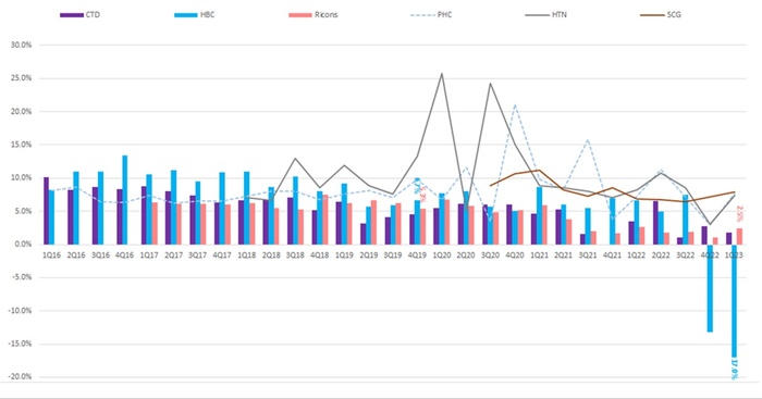 Hầu hết doanh nghiệp xây dựng đang phải sống bằng các hợp đồng cũ, với giá thấp, và chịu chi phí nhiên - nguyên vật liệu tăng cao, khiến biên lợi nhuận gộp suy giảm mạnh. Đơn cử, biên lợi nhuận gộp của 3 doanh nghiệp đầu ngành là Coteccons (HoSE: CTD), Hòa Bình (HoSE: HBC), Ricons trong quý I/2023 chỉ ở mức lần lượt là 1,8%, -17% và 2,5% - rất thấp và đã liên tục suy giảm trong các quý gần đây cũng như rất kém so với giai đoạn 2016 – 2019.
