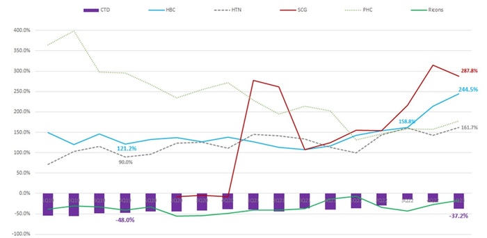 Bên cạnh đó, việc các chủ đầu tư dự án gặp khó khăn trong khâu bán hàng, huy động vốn (vay ngân hàng, trái phiếu doanh nghiệp riêng lẻ), đã ảnh hưởng tới khả năng thanh toán công nợ cho nhà thầu. Hệ quả tất yếu là các nhà thầu phải trích lập dự phòng nợ xấu rất lớn, điển hình như CTD và HBC năm 2022 phải trích lập lần lượt hơn 1.000 tỷ đồng và gần 400 tỷ đồng.
