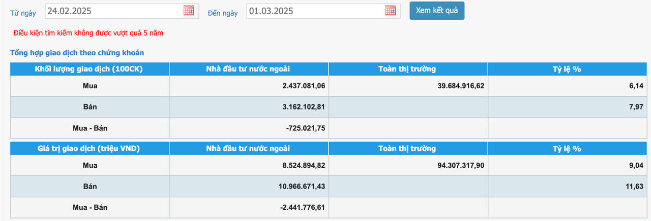 Trên HoSE, nhà đầu tư nước ngoài bán ròng cả 5 phiên liên tiếp, tổng giá trị đạt 2.441 tỷ đồng. Lực bán tập trung mạnh vào phiên 27/2 (-639,02 tỷ đồng) và 28/2 (-985,69 tỷ đồng). Các phiên còn lại ghi nhận giá trị bán ròng dao động từ 250-330 tỷ đồng.
