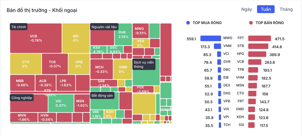 Ở chiều ngược lại, MWG dẫn đầu danh sách mua ròng với giá trị 559,1 tỷ đồng. Trước đó, cổ phiếu này liên tục nằm trong danh sách bán ròng của khối ngoại, nhưng dòng tiền đã đảo chiều trong tuần qua.
