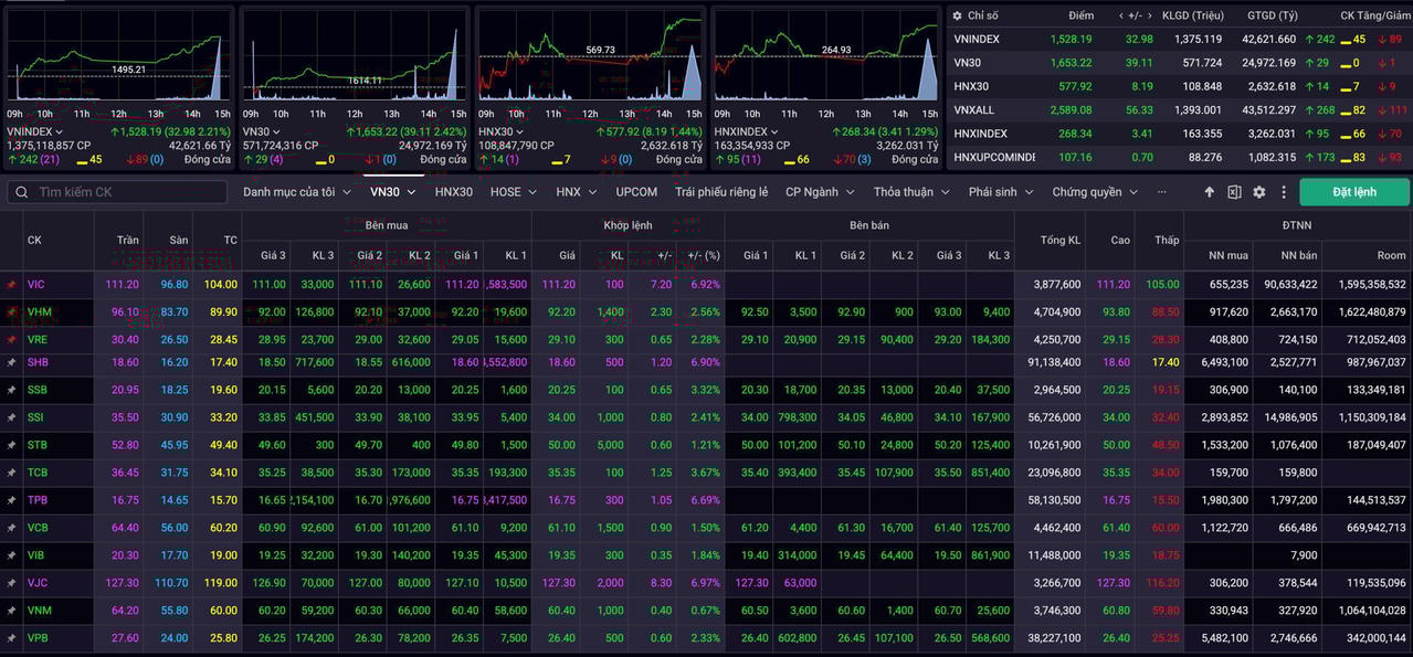Kết phiên, VN-Index đóng cửa tại 1.528 điểm, tăng gần 33 điểm, trong khi chỉ số VN30 vọt hơn 39 điểm, đạt 1.653 điểm. Tổng giá trị giao dịch trên cả ba sàn đạt gần 47.000 tỷ đồng, trong đó sàn HOSE ghi nhận hơn 42.600 tỷ đồng, sàn HNX ghi nhận 3.260 tỷ đồng, còn thanh khoản sàn UPCoM vượt mốc 1.000 tỷ đồng.