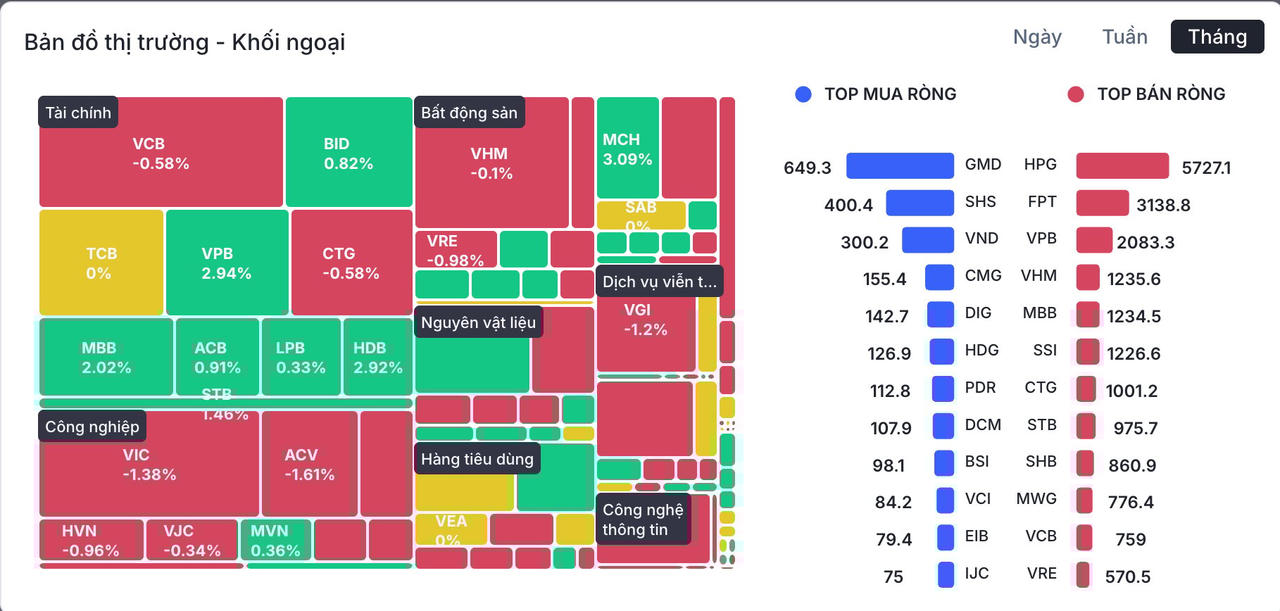 Theo thống kê từ Wichart, cổ phiếu bị khối ngoại bán ròng mạnh nhất trong tháng là HPG của Hòa Phát, với giá trị hơn 5.727 tỷ đồng, cao hơn 82% so với cổ phiếu đứng thứ hai trong danh sách là FPT (bán ròng 3.138,8 tỷ đồng). Đáng chú ý, áp lực bán không chỉ tập trung ở nhóm sản xuất – công nghệ mà còn lan rộng sang nhiều mã vốn hóa lớn thuộc ngành ngân hàng, chứng khoán và bất động sản.