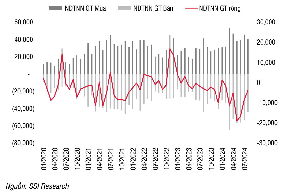Một diễn biến đáng chú ý nữa là khối ngoại giảm tốc bán ròng. Lượng bán ròng ghi nhận ở mức 3.770 tỷ trong tháng 8, quy mô bán ròng đã giảm đáng kể so với các tháng trước