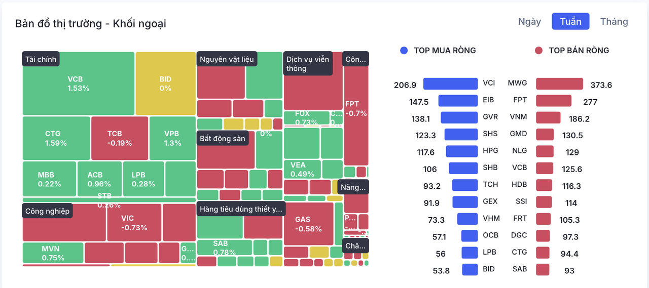 Ở chiều ngược lại, VCI bất ngờ dẫn đầu danh mục mua ròng của khối ngoại với giá trị 206,9 tỷ đồng. Đây là lần đầu tiên kể từ cuối tháng 9, VCI đón nhận dòng vốn ngoại mạnh mẽ trở lại. Tiếp theo là các cổ phiếu EIB (147,5 tỷ đồng), GVR (138,1 tỷ đồng), SHS (123,3 tỷ đồng), HPG (117,6 tỷ đồng), SHB (106 tỷ đồng), TCH (93,2 tỷ đồng), GEX (91,9 tỷ đồng), VHM (73,3 tỷ đồng),… Đáng chú ý, SHS, GEX và TCH duy trì xu hướng thu hút dòng tiền ngoại trong nhiều tuần liên tiếp.