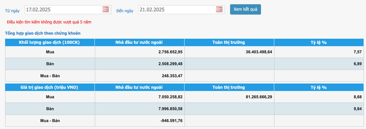 Trong tuần giao dịch từ ngày 17/2 đến 21/2, khối ngoại tiếp tục xu hướng rút ròng với tổng giá trị bán ròng đạt hơn 936 tỷ đồng. Đáng chú ý, lực cung mạnh nhất diễn ra trong phiên 17/2 khi khối ngoại rút ròng 651 tỷ đồng. Ngược lại, phiên 19/2 ghi nhận trạng thái mua ròng với giá trị đạt 394 tỷ đồng.