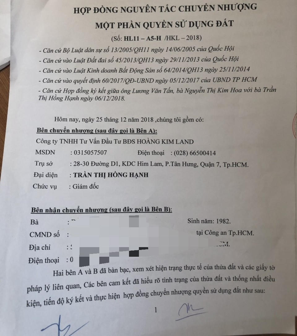 Hợp đồng nguyên tắc chuyển nhượng giữa Hoàng Kim Land và chị Đ.T.N.H