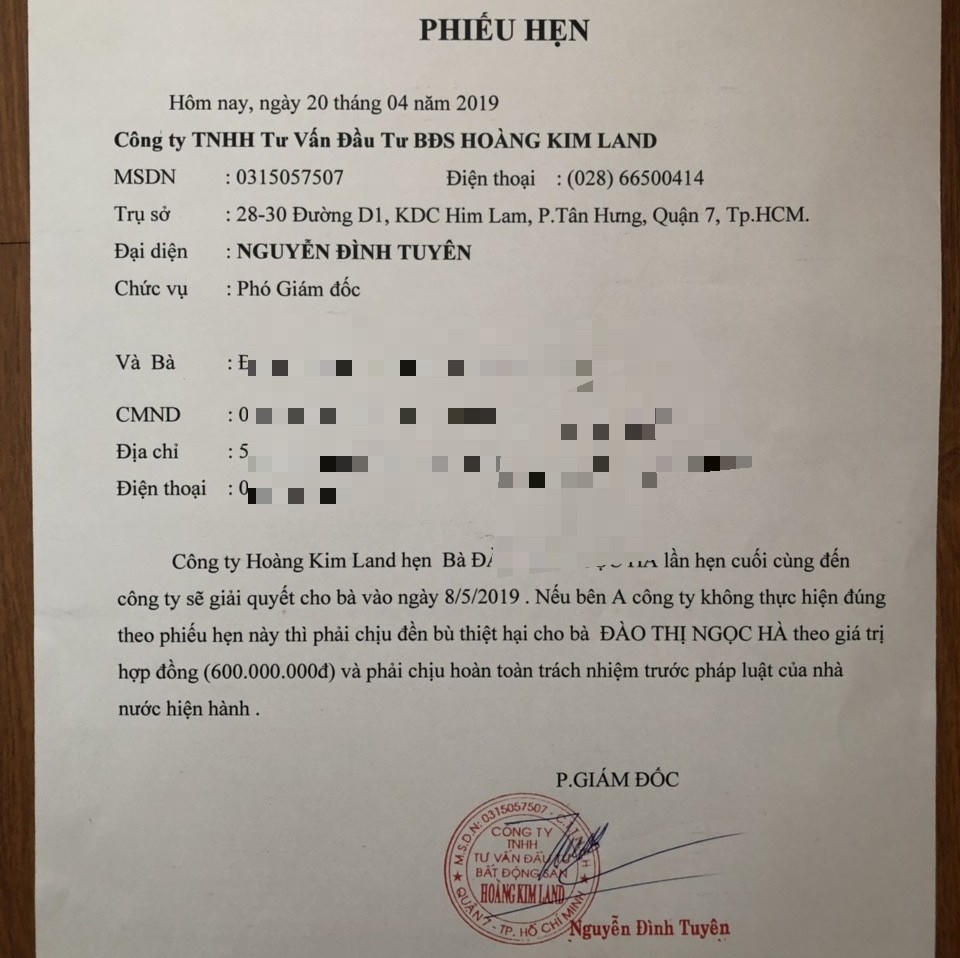 Quá bức xúc, chị Đ.T.N.H đòi yêu cầu cơ quan chức năng can thiệp, thì được bà Trần Thị Mỹ Hiền xưng là Chủ tịch HĐQT Hoàng Kim Land đứng ra cam kết và tiếp tục hẹn chị đến ngày 20/4 sẽ giải quyết thanh lý hợp đồng cho chị.