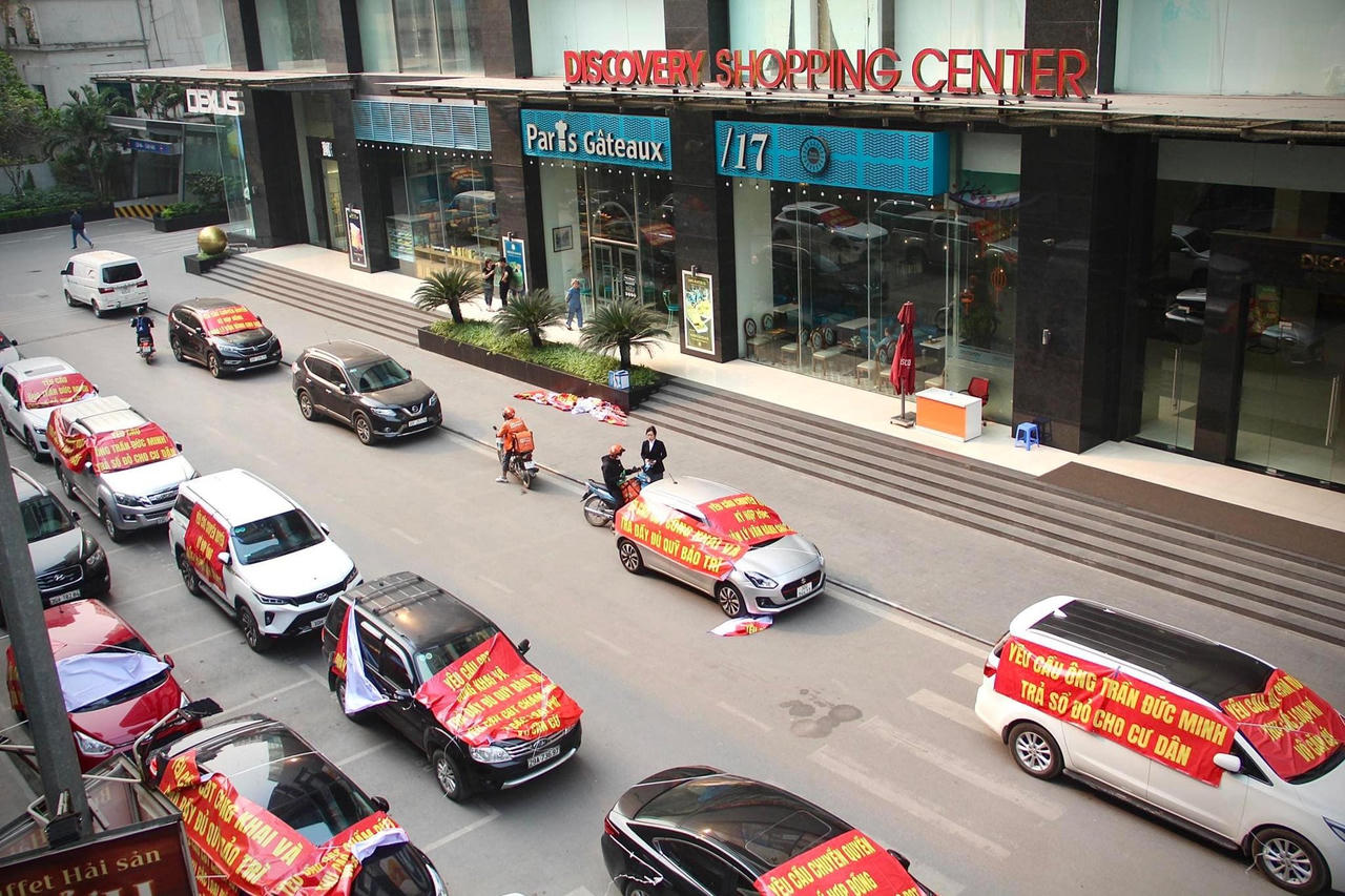 Hàng loạt xe của cư dân căng băng rôn, tập trung trước cửa trung tâm thương mại Discovery Complex Cầu Giấy (Hà Nội), khiến các cửa hàng kinh doanh tại đây chịu ảnh hưởng nặng nề.