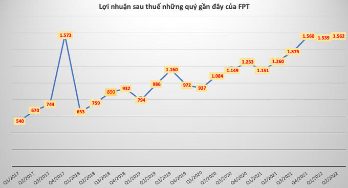 Kết quả, quý 2 FPT báo lãi sau thuế 1.562 tỷ đồng, tăng trưởng 24% so với số lãi 1.260 tỷ đồng đạt được quý 2 năm ngoái, trong đó lợi nhuận sau thúe thuộc về cổ đông công ty mẹ đạt hơn 1.250 tỷ đồng.