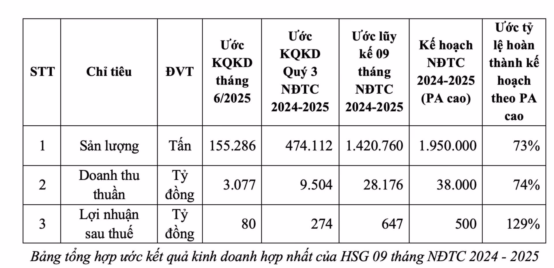Lũy kế 9 tháng của niên độ tài chính 2024 - 2025 (từ ngày 1/10/2024 đến ngày 30/6/2025), sản lượng hợp nhất doanh nghiệp ước đạt 1.420.760 tấn, hoàn thành 73% kế hoạch.