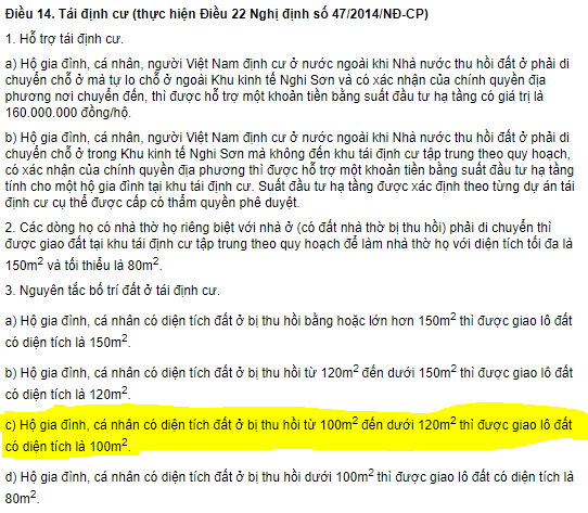 Như vậy, đối chiếu với quyết định này, hộ ông Cao Xuân Bình thuộc trường hợp có diện tích thu hồi từ 100m2 đến dưới 120m2 thì được giao lô đất 100m2. Thế nhưng, tại quyết định số 2535/QĐ-UBND ngày 26/4/2019 của UBND huyện Tĩnh Gia (nay là TX. Nghi Sơn) về việc giao đất ở tái định cư và thu tiền sử dụng đất đối với hộ gia đình, cá nhân xã Mai Lâm tại khu tái định cư Trúc Lâm, ông Cao Xuân Bình chỉ được giao diện tích tái định cư là 80m2.