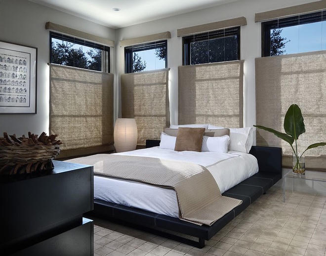 Nếu gia đình bạn đã thiết kế cửa kính sát sàn nhà, chúng ta có thể kê giường ngủ cách xa cửa kính hoặc dùng đề can che bớt phần cửa kính dưới sàn lại.