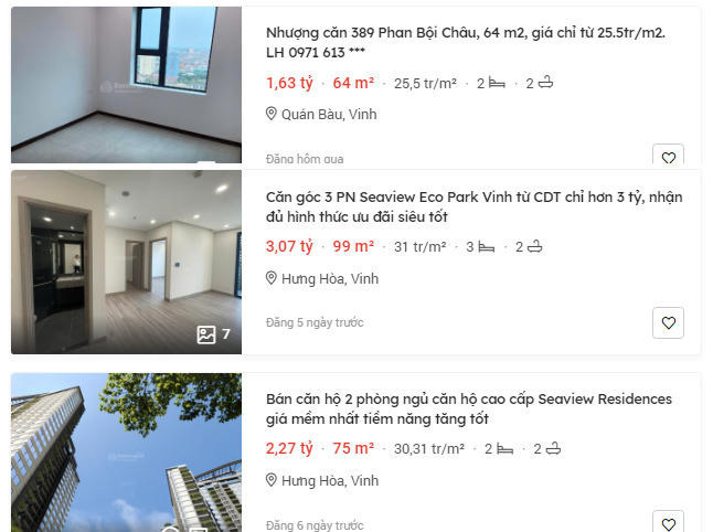 Khảo sát trên một số trang mua bán bất động sản, giá chung cư bình dân tại TP. Vinh đang để ở mức 25-30 triệu đồng/m2. Trước đó, thời điểm năm 2022, giá trung bình tại thành phố này chỉ khoảng 15-16 triệu đồng/m2.