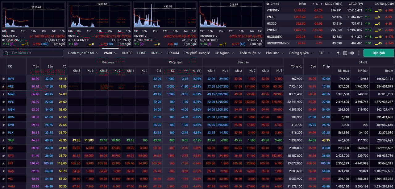 Đáng chú ý, chỉ số VN30-Index giảm sâu hơn cả VN-Index khi mất tới 73,1 điểm. Thậm chí, có thời điểm, chỉ số đại diện cho nhóm cổ phiếu vốn hoá lớn nhất thị trường đã rơi khỏi mốc tâm lý 1.200.