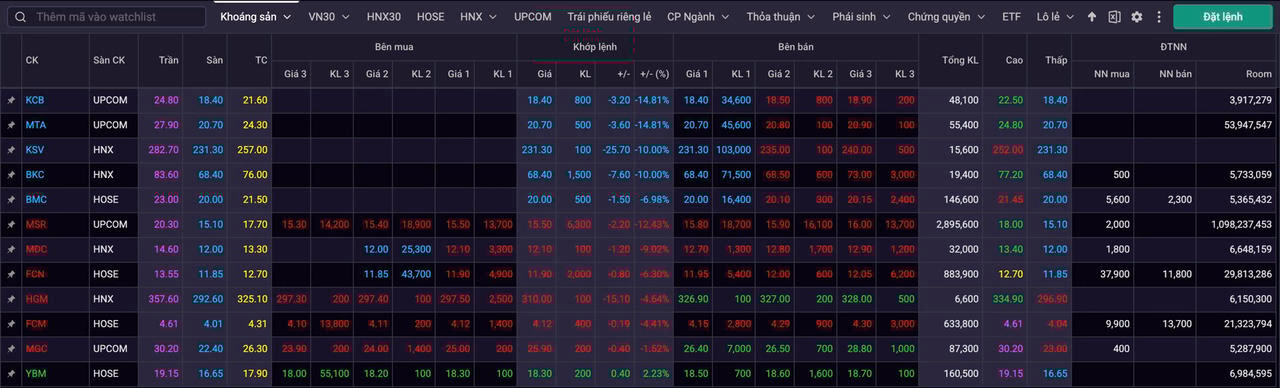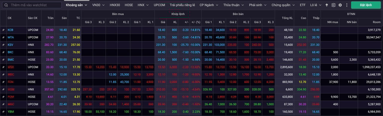Ngay cả nhóm khoáng sản, “điểm sáng” hiếm hoi giữa “tâm bão” những ngày qua, cũng đã bị “quật ngã”. Duy nhất cổ phiếu FCM của Công ty CP Khoáng sản FECON giữ được sắc xanh, trong khi các cổ phiếu từng tăng mạnh như KCB, MTA, KSV, BKC, BMC giảm sàn trắng bên mua, và những cái tên còn lại chuyển đỏ.