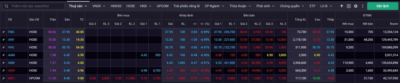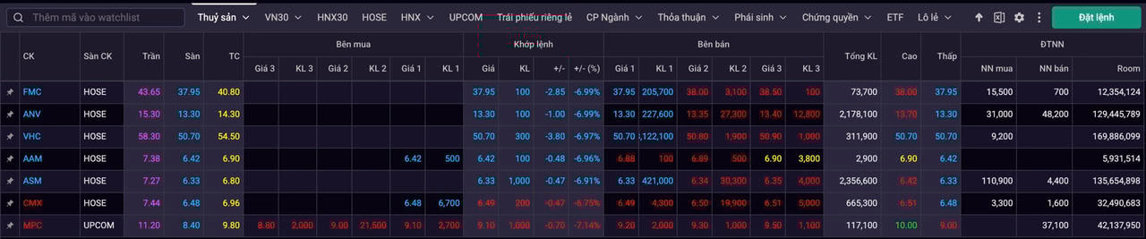 Tương tự, tại các nhóm ngành chịu ảnh hưởng trực tiếp từ chính sách thuế quan mới của Mỹ như thuỷ sản, dệt may, gỗ,… sắc xanh lơ chiếm ưu thế khắp bảng điện.