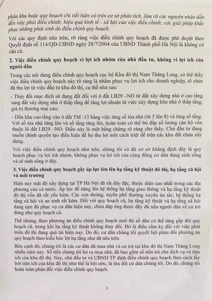 Một trong số những nội dung mà cư dân Ciputra kiến nghị về việc không đồng ý với đề xuất điều chỉnh quy hoạch của chủ đầu tư.