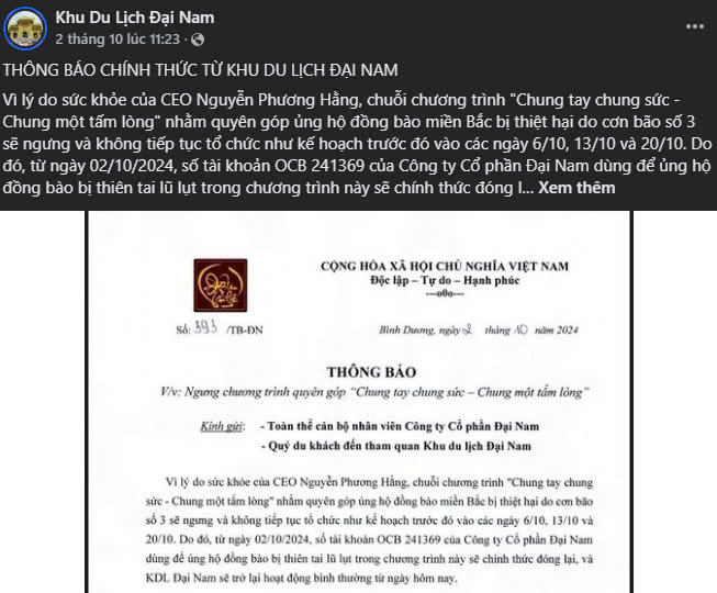 Thông báo này cho biết, do vấn đề sức khỏe của nữ CEO, chương trình "Chung tay chung sức - Chung một tấm lòng" sẽ không tiếp tục tổ chức vào các ngày 6/10, 13/10 và 20/10 như dự kiến. Khu du lịch Đại Nam cũng sẽ trở lại hoạt động bình thường từ ngày 2/10/2024.