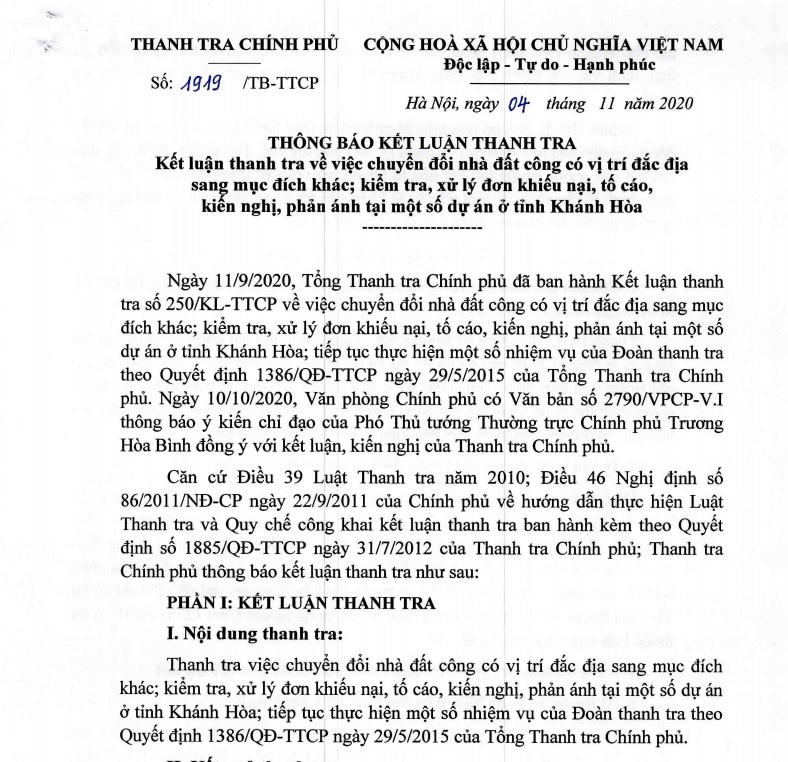 Từ những sai phạm trên, TTCP đã kiến nghị Thủ tướng Chính phủ xử lí kỉ luật nghiêm minh trách nhiệm cá nhân và trách nhiệm người đứng đầu đối với Chủ tịch UBND tỉnh Khánh Hòa; xử lí kỉ luật phù hợp đối với các Phó chủ tịch UBND tỉnh có liên quan trong giai đoạn thanh tra từ 1/1/2010 - 31/6/2017.