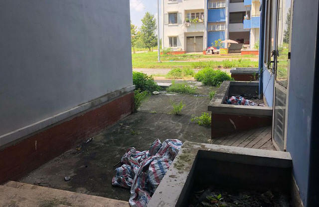 Rong rêu bám đầy tường, các tòa nhà chung xuất hiện vết nứt, kính hư hỏng, rác thải bốc mùi khó chịu