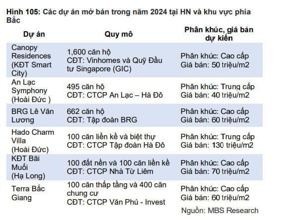 Theo đánh giá của MBS, giá chung cư đang ở mức cao trong khi các sản phẩm thấp tầng về mức hợp lý có thể tạo ra xu hướng nhà đầu tư chốt lời phân khúc căn hộ và tìm đến các sản phẩm thấp tầng như liền kề và biệt thự. Nhờ đó, theo MBS, phân khúc liền kề sẽ có tín hiệu hồi phục rõ nét hơn kể từ cuối 2024.