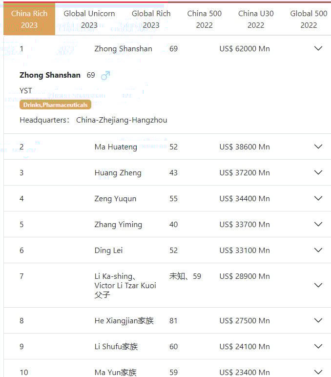 Đáng chú ý, trong danh sách, Zhong Shanshan, ông chủ đế chế nước đóng chai Nongfu, đứng đầu danh sách giàu có tại Trung Quốc trong 3 năm liền, với khối tài sản 62 tỷ USD.