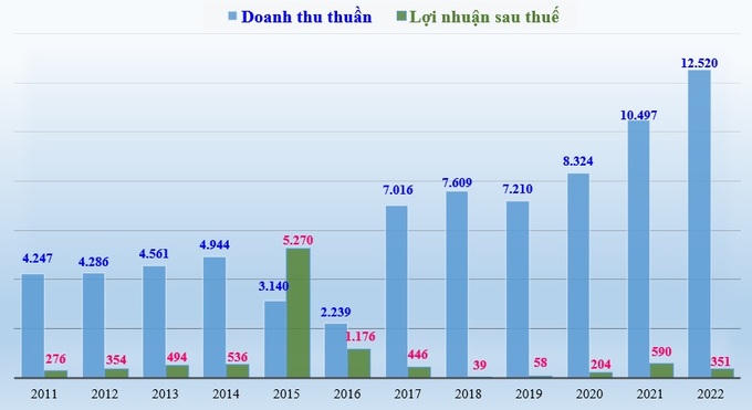 Doanh thu thuần và lợi nhuận sau thuế thuộc về cổ đông công ty mẹ của CTCP Tập đoàn Kido giai đoạn 2011 - 2022 (đơn vị tính: tỷ đồng).