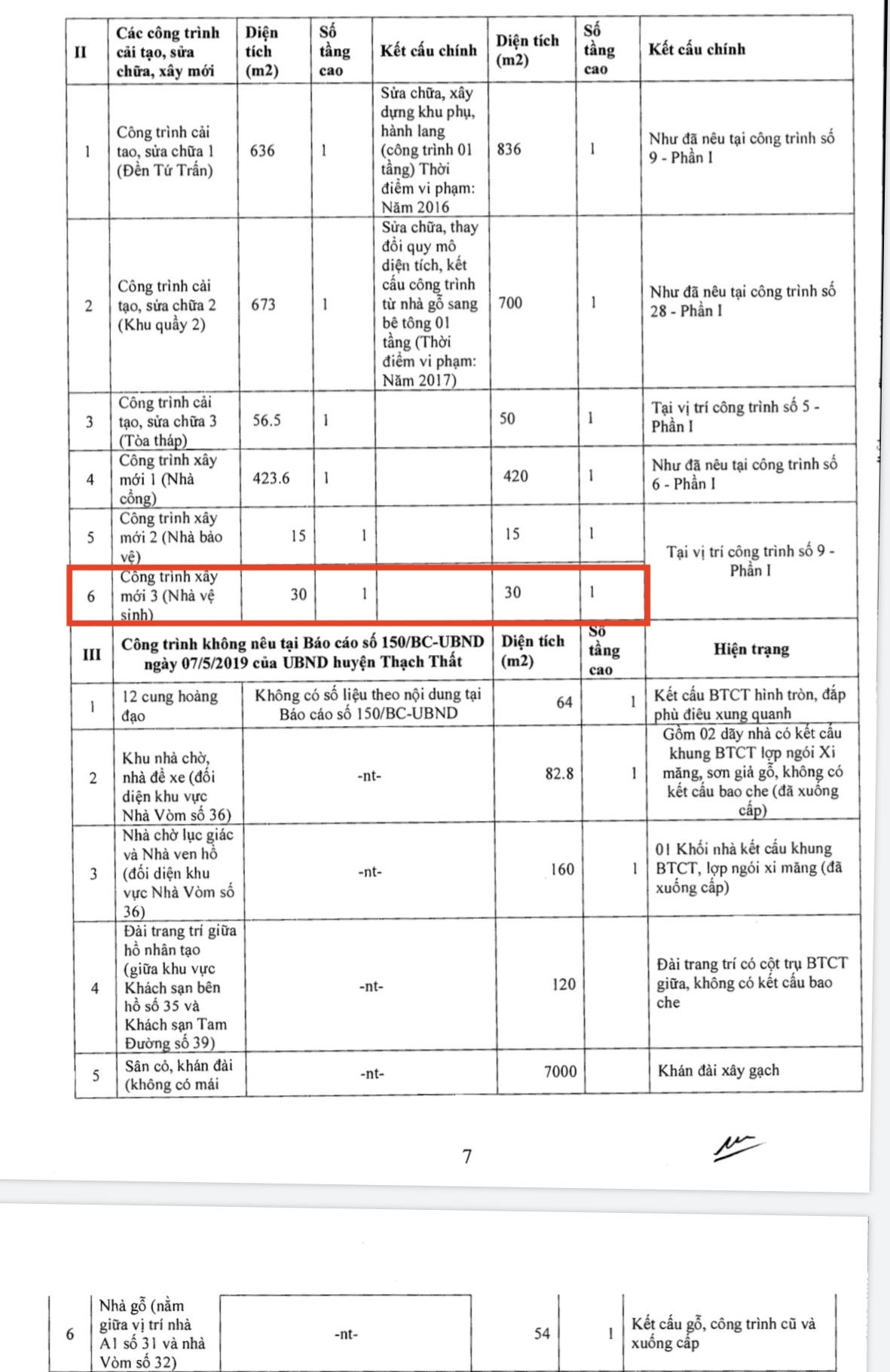 Còn 6 công trình không nêu tại báo cáo của UBND huyện Thạch Thất là những công trình có kết cấu đơn giản nhằm mục đích trang trí, không có kết cấu bao che, công trình kết cấu gỗ phục vụ làm nhà kho, công trình phục vụ nhu cầu sinh hoạt thiết yếu, chủ đầu tư đã nhận thức sai phạm, cam kết ngừng thi công để khắc phục hậu quả vi phạm, thiếu sót trong quá trình kiểm kê, tổng hợp báo cáo Thành phố khi lập hồ sơ đề xuất phê duyệt chủ trương đầu tư.