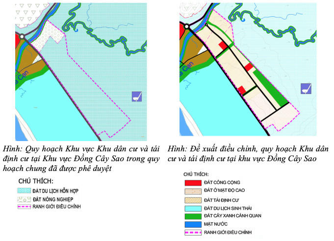 Trong đó, địa điểm số 7 khu vực Đồng Cây Sao điều chỉnh 203ha từ chức năng đất dịch vụ du lịch giải trí phức hợp và sân golf và đất nông nghiệp theo quy hoạch chung được duyệt thành chức năng đất tái định cư và đất đơn vị ở được quy hoạch đồng bộ hạ tầng xã hội, hạ tầng kỹ thuật, công trình công cộng, cây xanh phục vụ dân cư tại khu vực và lân cận.