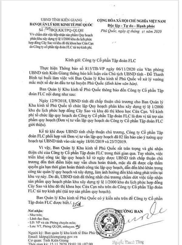 Giữa tháng 11/2020, UBND tỉnh Kiên Giang có công văn số 1549/BQLKTTPQ-QLQH về việc chấm dứt tiếp nhận sản phẩm quy hoạch 1/2000 khu vực Đồng Cây Sao do FLC tài trợ lập quy hoạch do chưa thống nhất được kết quả định hướng chung.