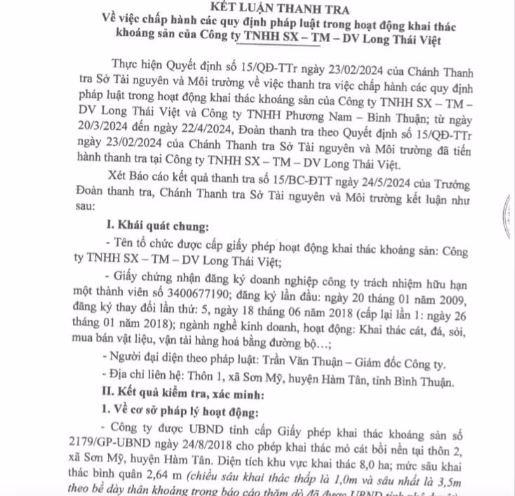 Thanh tra Sở Tài nguyên và Môi trường tỉnh Bình Thuận mới đây công bố kết luận thanh tra về việc chấp hành các quy định pháp luật trong hoạt động khai thác khoáng sản của Công ty TNHH SX-TM - DV Long Thái Việt (Công ty Long Thái Việt).