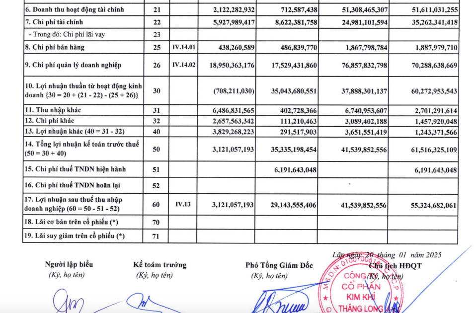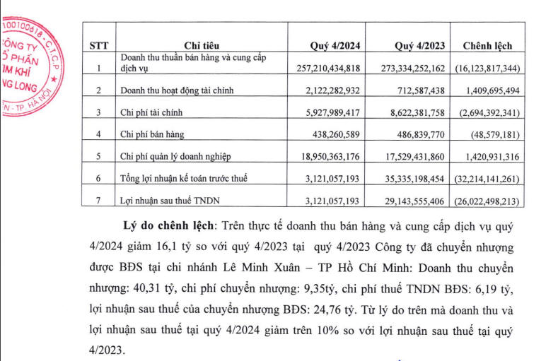 Kim khí Thăng Long cho biết lý do chênh lệch là trên thực tế doanh thu bán hàng và cung cấp dịch vụ quý IV/2024 giảm 16,1 tỷ đồng so với quý IV/2023, tại quý IV/2023 công ty đã chuyển nhượng được BĐS tại chi nhánh Lê Minh Xuân – TP. HCM. Doanh thu chuyển nhượng 40,31 tỷ đồng; chi phí chuyển nhượng 9,35 tỷ; chi phí thuế TNDN bất động sản 6,19 tỷ; lợi nhuận sau thuế của chuyển nhượng bất động sản 24,76 tỷ đồng.