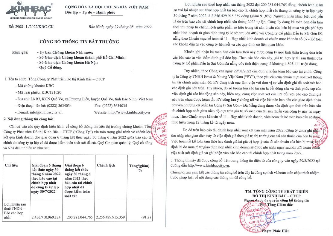 Phía Kinh Bắc giải trình nguyên nhân khác biệt chủ yếu là do trên báo cáo tài chính hợp nhất 6 tháng 2022 tự lập, công ty đang kế toán ban đầu tạm thời thu nhập từ chênh lệch giữa phần sở hữu trong tài sản thuần của bên bị mua và giá phí hợp nhất kinh doanh từ giao dịch tăng tỷ lệ sở hữu lên 48% với Công ty Cổ phần Đầu tư Sài Gòn Đà Nẵng theo Chuẩn mực kế toán số 11- Hợp nhất kinh doanh và chuẩn mực kế toán số 07 -Kế toán các khoản đầu tư vào công ty liên kết và các quy định có liên quan khác.