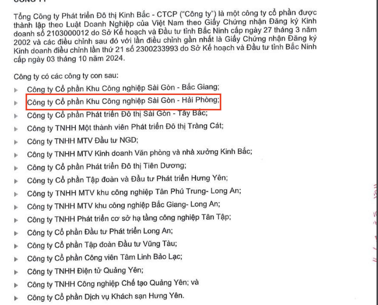 Được biết, Công ty cổ phần Khu công nghiệp Sài Gòn- Hải Phòng, công ty con của Tổng công ty Phát triển Đô thị Kinh Bắc - CTCP (mã chứng khoán: KBC) với tỷ lệ 89,29%.