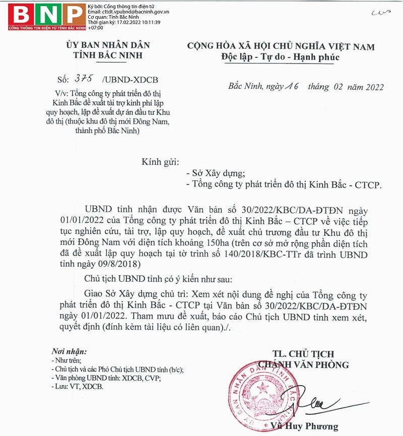 UBND tỉnh Bắc Ninh vừa có văn bản 375/UBND-XDCB gửi Sở Xây dựng về việc Tổng công ty phát triển đô thị Kinh Bắc (Mã CK: KBC) đề xuất tài trợ kinh phí lập quy hoạch, lập đề xuất dự án đầu tư khu đô thị mới Đông Nam, TP. Bắc Ninh.