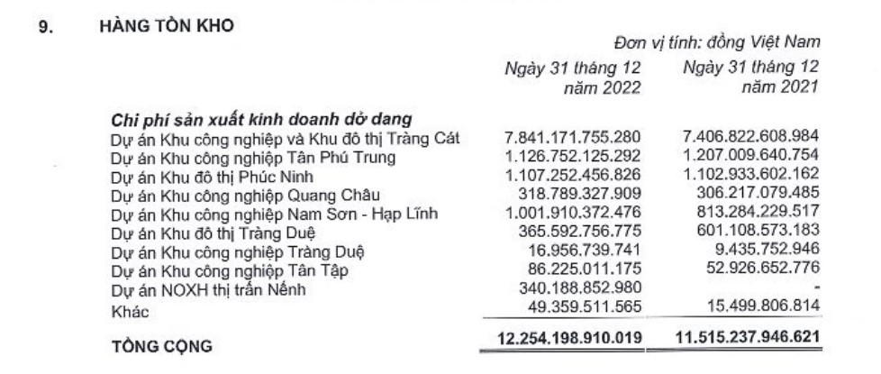 Tính đến cuối năm 2022, tổng tài sản của Kinh Bắc trên 34.930 tỷ đồng, tăng 12,7% so với đầu năm. Chiếm phần lớn là tồn kho hơn 12.250 tỷ đồng (tăng 6%), các khoản phải thu ngắn và dài hạn trên 11.700 tỷ đồng (tăng 8%). Bên cạnh các dự án khu công nghiệp dở dang, Kinh Bắc đang triển khai dự án nhà ở xã hội thị trấn Nếnh (Bắc Giang).