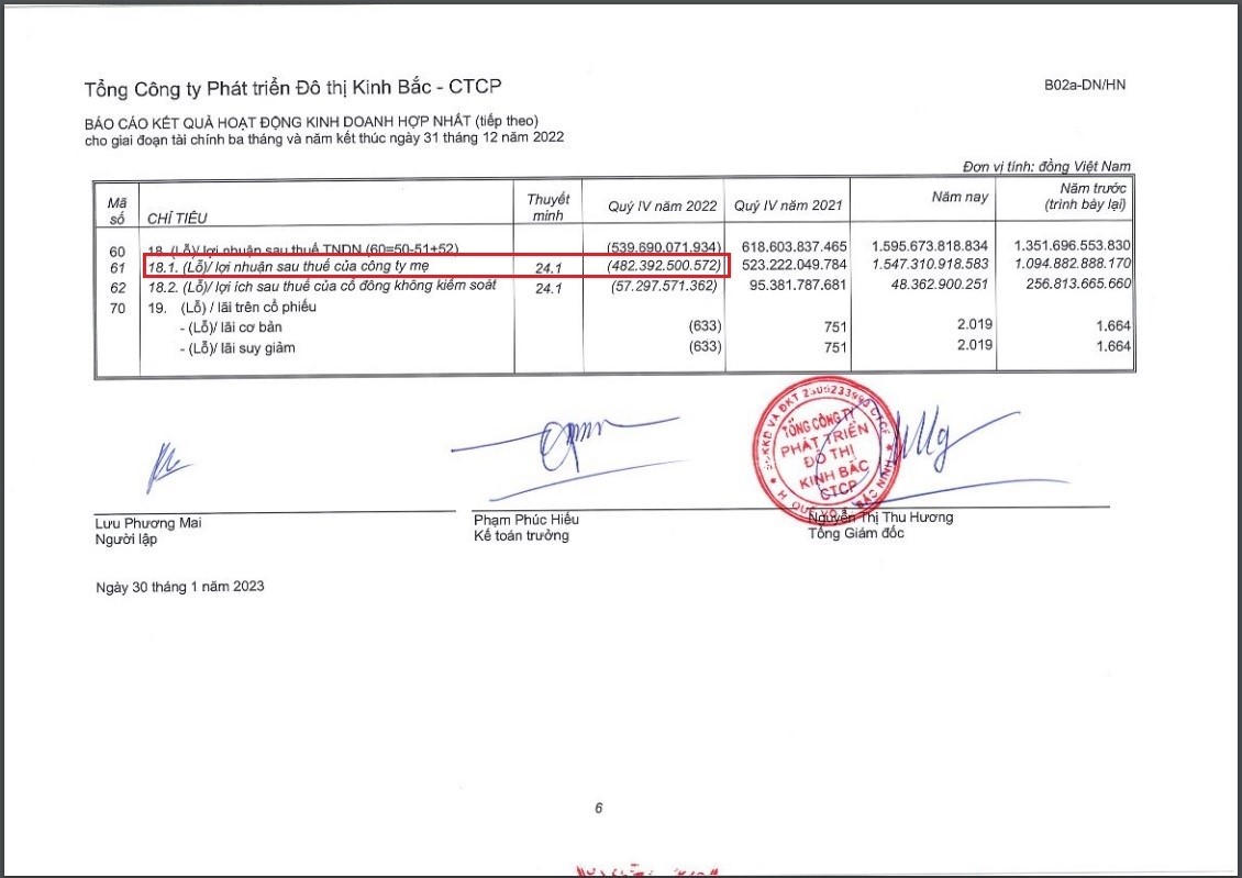 Trong quý IV/2022, Kinh Bắc ghi nhận doanh thu thuần và lợi nhuận lần lượt âm hơn 331 tỷ đồng và 482 tỷ đồng. Bên cạnh đó, tính đến cuối năm 2022, doanh nghiệp cũng còn hơn 17.000 tỷ đồng nợ phải trả.