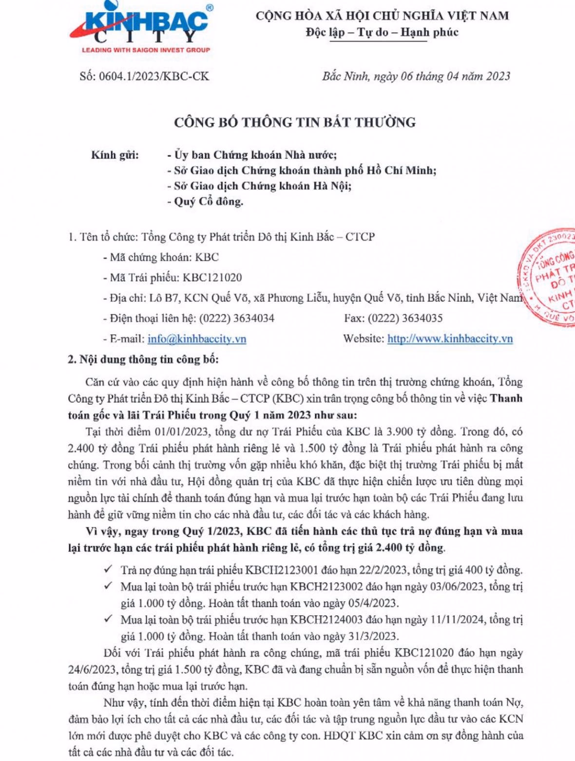 Kinh Bắc công bố thông tin về tình hình thanh toán lãi, gốc trái phiếu trong quý I/2023. |