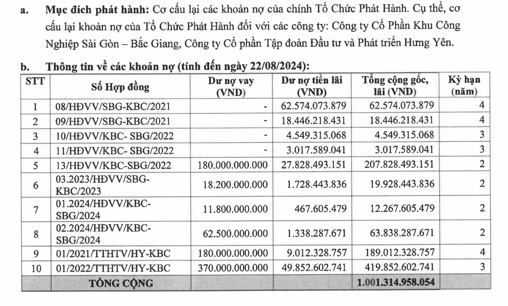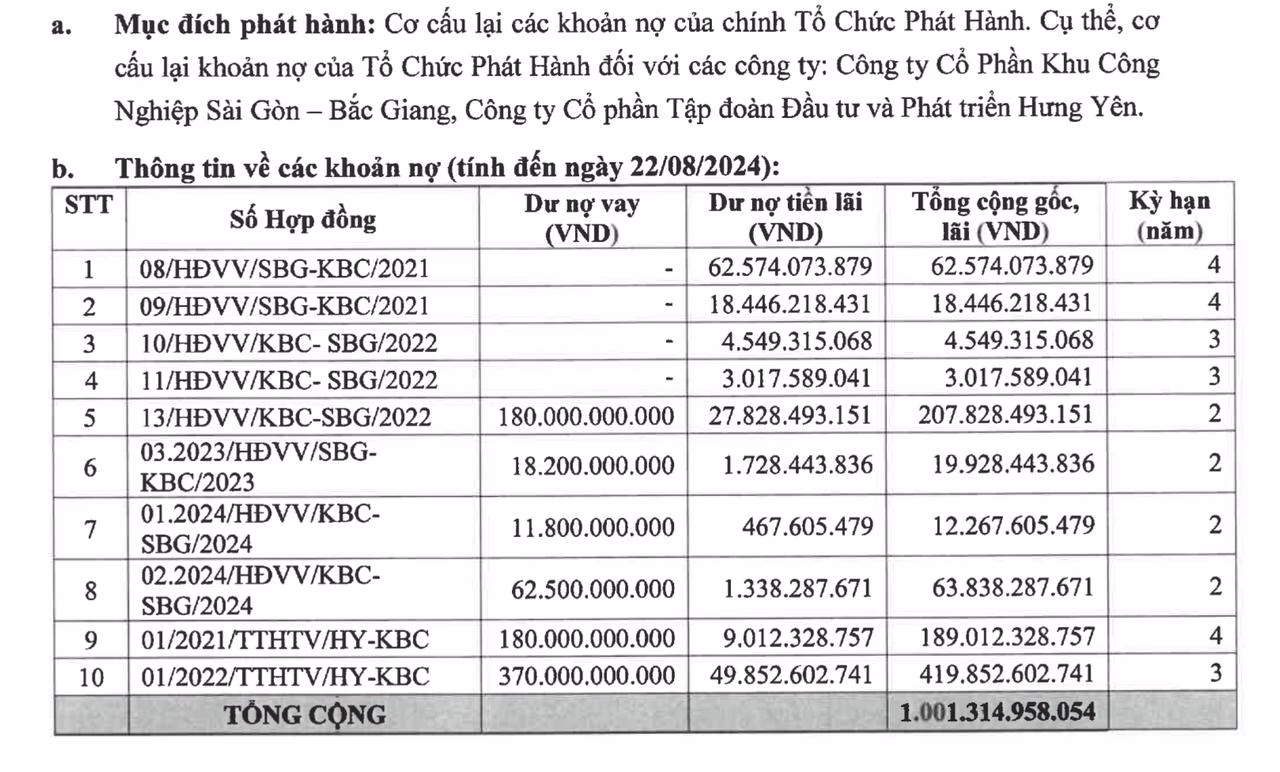 Mục đích phát hành nhằm cơ cấu lại nợ gốc, nợ lãi của Kinh Bắc với Công ty cổ phần Khu Công nghiệp Sài Gòn - Bắc Giang theo Hợp đồng vay và Công ty cổ phần Tập đoàn Đầu tư và Phát triển Hưng Yên. Cụ thể dư nợ vay gốc là 822,5 tỷ đồng, lãi là 178,5 tỷ đồng.