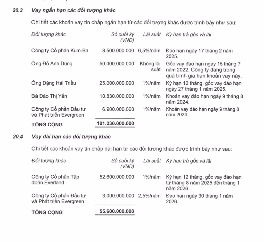 Cụ thể vay ngắn hạn và dài hạn của Công ty cổ phần Kum Ba là 8,5 tỷ đồng; Công ty Đầu tư và Phát triển Evergereen là 9,9 tỷ đồng; Công ty cổ phần Tâp đoàn Everland là 52,6 tỷ đồng và 3 cá nhân khác 85,8 tỷ đồng.