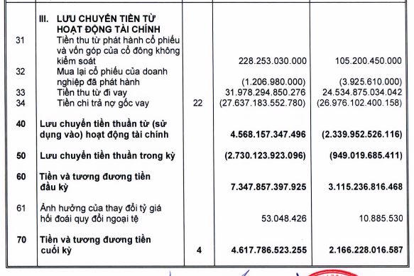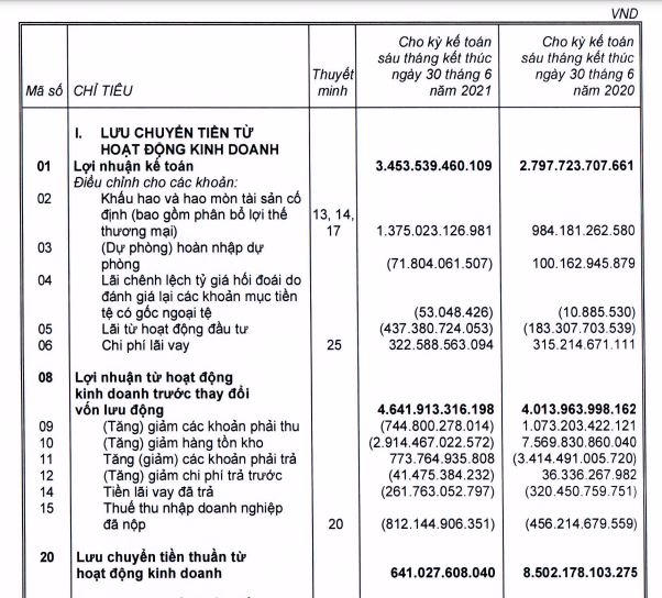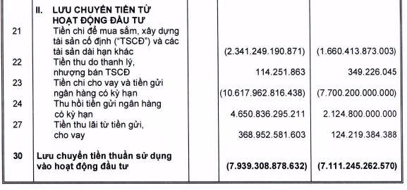 Bên cạnh đó, dòng tiền hoạt động đầu tư âm hơn 7.939 tỷ đồng và lưu chuyển tiền thuần trong kỳ cũng âm hơn 2.730 tỷ đồng, trong khi cùng kỳ 2020 chỉ âm hơn 949 tỷ đồng.