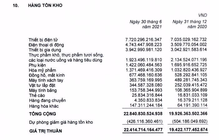 Hàng tồn kho tập trung chủ yếu ở thiết bị điện tử hơn 7.720 tỷ đồng, tương đương tăng 10% và điện thoại di động ghi nhận hơn 4.743 tỷ đồng, tăng 35% so với đầu năm. Ngoài ra, thiết bị gia dụng cũng tăng nhẹ lên 3.943 tỷ đồng; mặt hàng máy tính bảng tăng 42% lên gần 154 tỷ đồng; sản phẩm đồng hồ và mắt kính tăng 28% lên mức 677,4 tỷ đồng; thực phẩm khô, các loại nước uống... cũng ghi nhận còn hơn 1.923 tỷ đồng;...